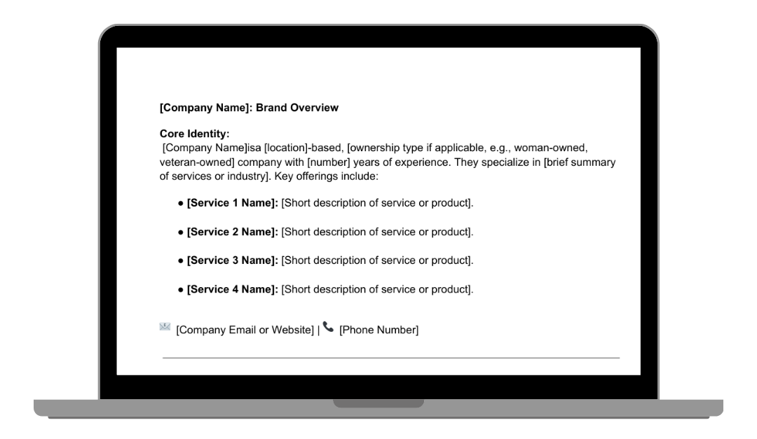 • Identify the core brand identity, including values, services, unique selling propositions, and brand voice.
